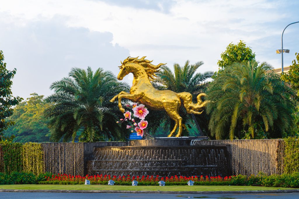 Standing at approximately five metres tall, the golden horse is sculpted in the dynamic posture of a “Thiên Lý Mã” the legendary steed known for speed, strength, and endurance. With its powerful legs mid-gallop, head held high, and mane flowing dramatically backward, the sculpture radiates vitality, ambition, and forward momentum. Every muscle on the horse’s body has been meticulously shaped, reflecting the artisan’s exceptional craftsmanship and attention to detail.
