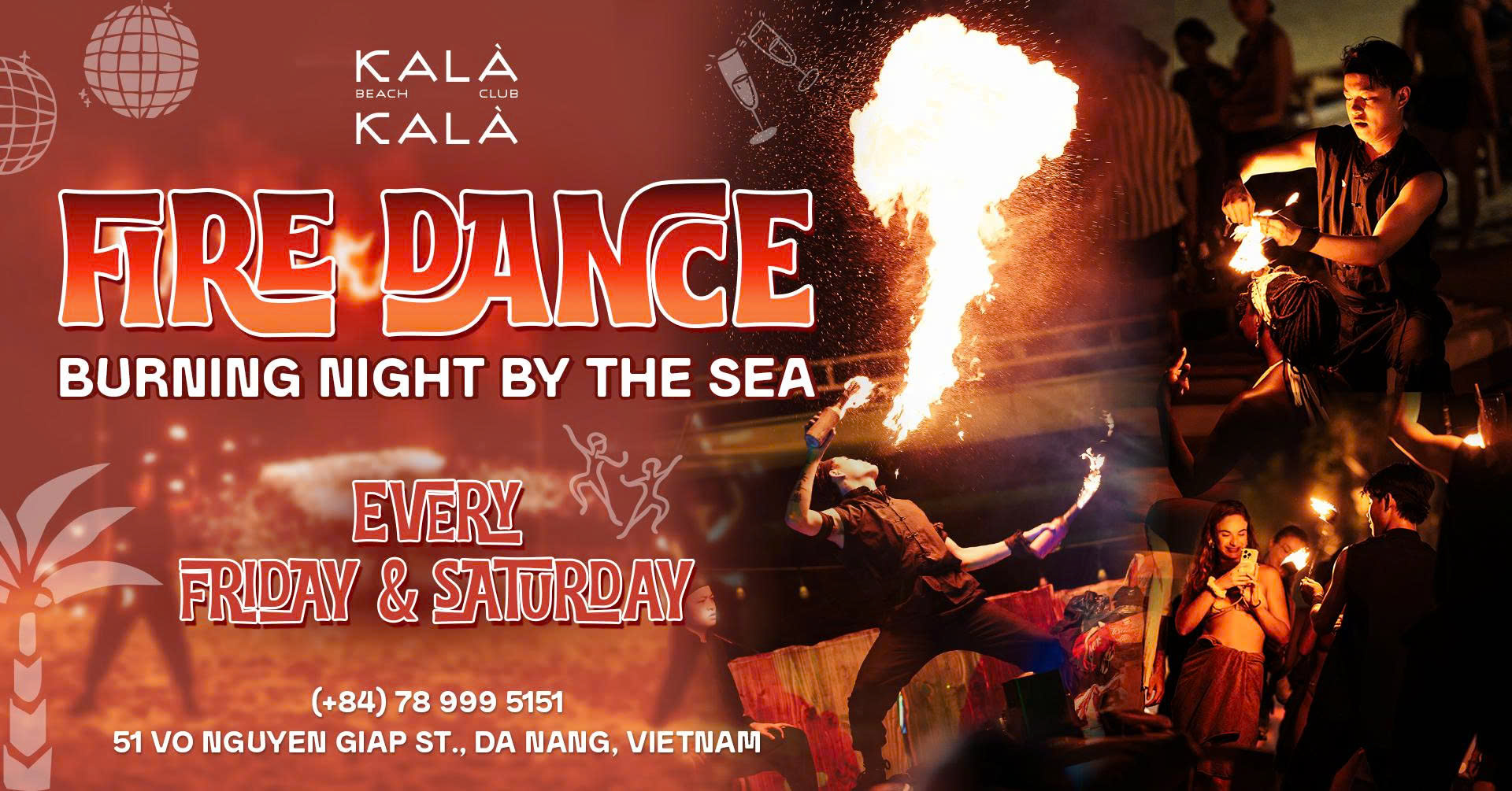 Đến với Kalà Kalà Beach Club mỗi tối Thứ Sáu và Thứ Bảy hàng tuần để cùng hòa mình với âm nhạc, thưởng thức màn trình diễn nghệ thuật rực rỡ và cảm nhận nhịp lửa đốt cháy mọi giác quan.