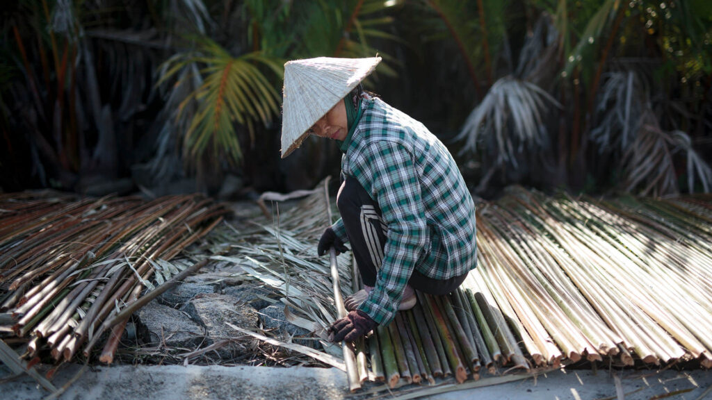 In each home, bamboo provides the sturdy frame, while palm leaves form the protective layers. Rattan and nylon cords tie the elements together. The precision and harmony in this manual process highlight both technical mastery and aesthetic sensibility the essence of Vietnamese vernacular architecture.